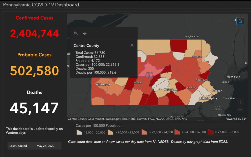 Centre County has had a total of 36,730 COVID-19 cases (32,558 confirmed and 4,172 probable) since March 2020.