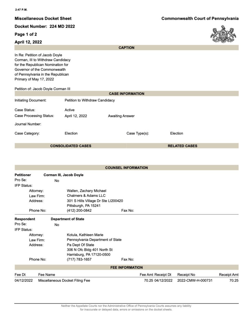 Corman, who as president pro tempore is the Senate’s highest ranking Republican, filed a petition with the Commonwealth Court on Tuesday afternoon to withdraw his candidacy from the May 17 primary.
