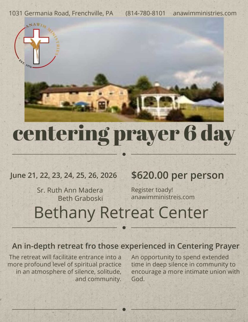 This 6 Day Retreat will be an in-depth retreat for those experienced in Centering Prayer. The retreat will facilitate entrance into a more profound level of spiritual practice in an atmosphere of silence, solitude, and community, with an opportunity to spend extended time in deep silence in community to encourage a more intimate union with God. An existing Centering Prayer practice is a prerequisite for attending this retreat.