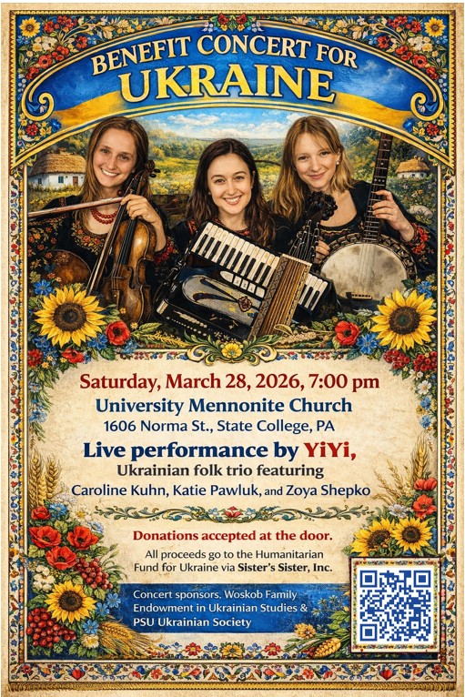 Ukrainian folk trio Yiyi from NYC (Caroline Kuhn, Katie Pawluk, and Zoya Shepko) will be performing traditional Ukrainian music with unique instrumentation and three-part harmonies live in a benefit concert for the Sister’s Sister charitable organization to provide aid to Ukrainian orphanages, hospitals, and other charitable organizations affected by the war in Ukraine.