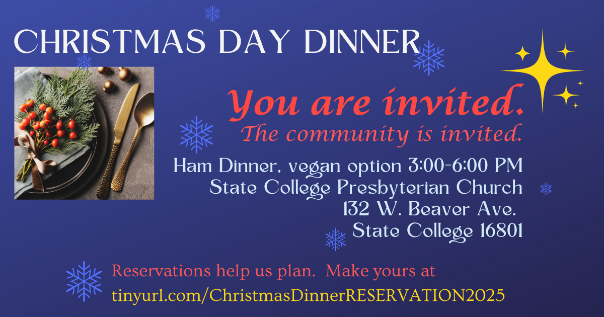 We are excited to share that State College Presbyterian Church (132 West Beaver Ave., State College, PA 16803) will again be hosting its annual free Christmas Dinner for the State College community.
