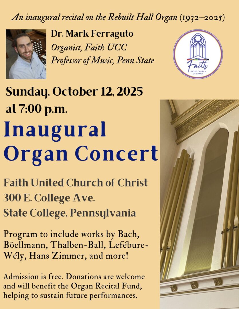 Dr. Mark Ferraguto performs an inaugural concert on the rebuilt 1932 Hall organ at Faith United Church of Christ. Program to include works by Bach, Böellmann, Thalben-Ball, Lefébure-Wély, Hans Zimmer, and more.