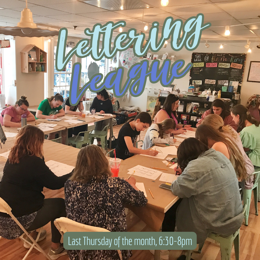 Join Shannon with Wright Lettering monthly on the last Thursday at The Makery for a laid back gathering with fellow letter lovers. Whether you’re a lettering newbie or novice, this will be a fun time of creating and connecting. Bring your own supplies for a lettering project, practice sheets, lettering questions, or just a blank journal to doodle in and a beverage of your choice!