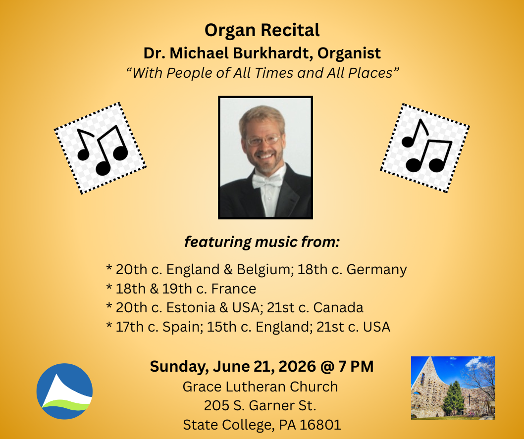 The public is invited to a free pipe organ recital on Sunday, June 21 at 7 PM at Grace Lutheran Church, 205 South Garner Street in State College. The organist is Dr. Burkhardt, Artist and Professor of Organ at Eastern Michigan University. The recital will include music from the 17th – 21st centuries from England, Belgium, Germany, France, Estonia, Spain, Canada and the USA.