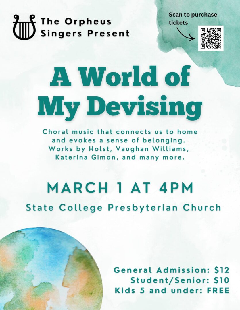 The Orpheus Singers present “A World of My Devising,” choral music that connects us to home and evokes a sense of belonging. The concert will take place on March 1st, 4pm, at the State College Presbyterian Church.