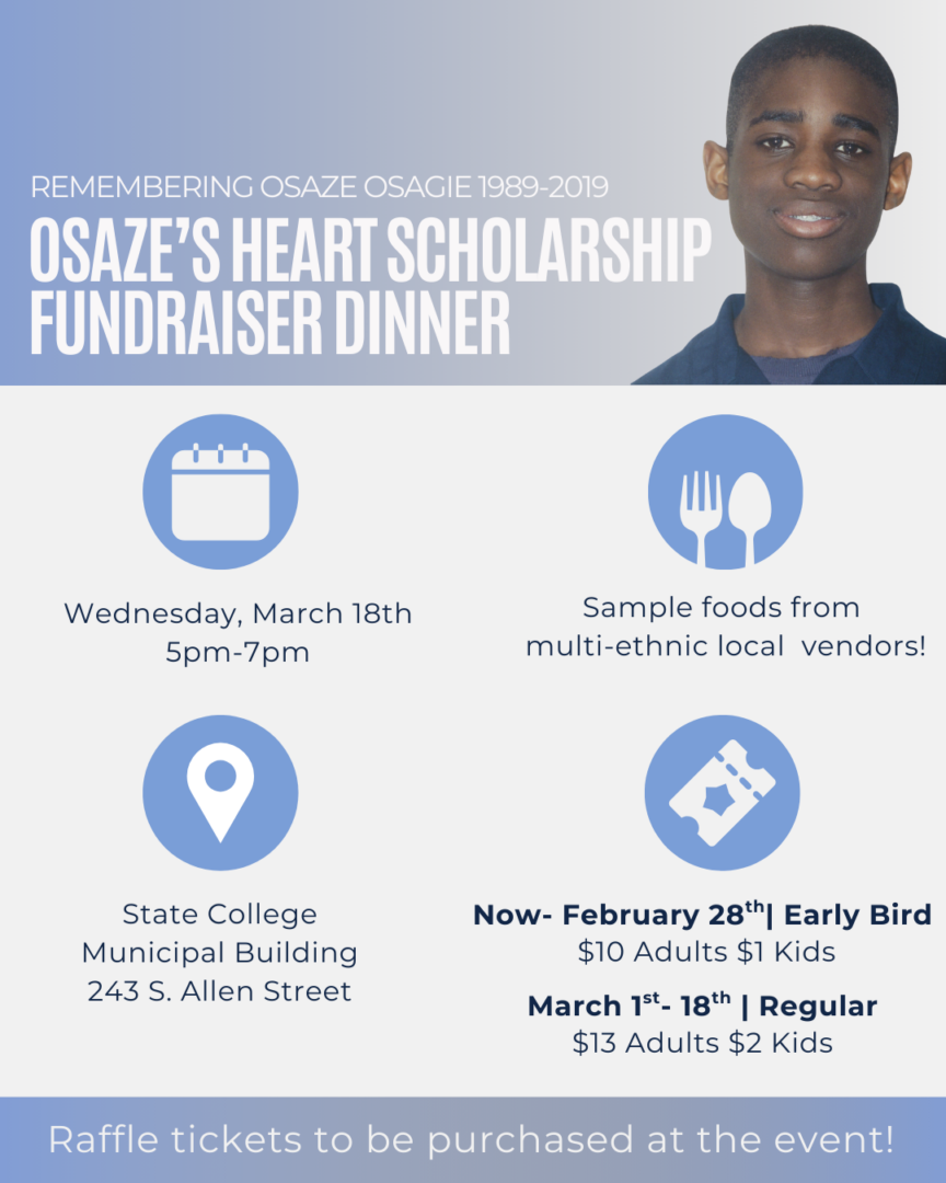 The 2026 Osaze’s Heart Scholarship Fundraiser dinner will take place on Wednesday, March 18 from 5pm to 7 pm at the State College Borough Municipal Building.