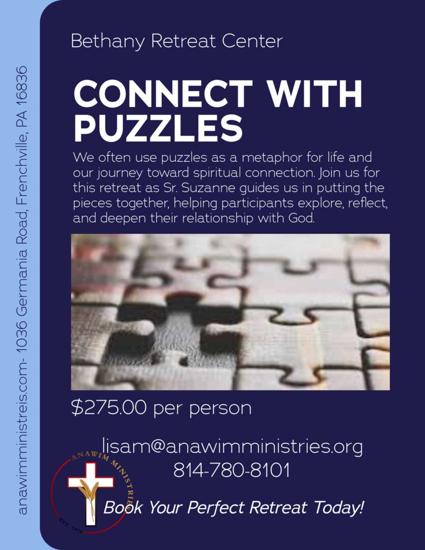 We often use puzzles as a metaphor for life and our journey toward spiritual connection. Join us for this retreat as Sr. Suzanne guides us in putting the pieces together, helping participants explore, reflect, and deepen their relationship with God.