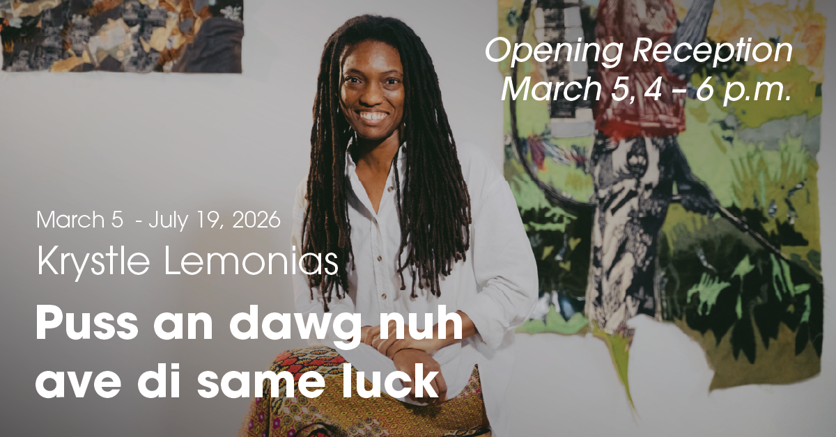 All are welcome to join us for a celebratory reception and meet artist Krystle Lemonias on Thursday, March 5, from 4–6 p.m. in Art Alley in the HUB-Robeson Center. “Puss an dawg nuh ave di same luck” is on view until July 19, 2026. Light refreshments provided, no RSVP necessary!