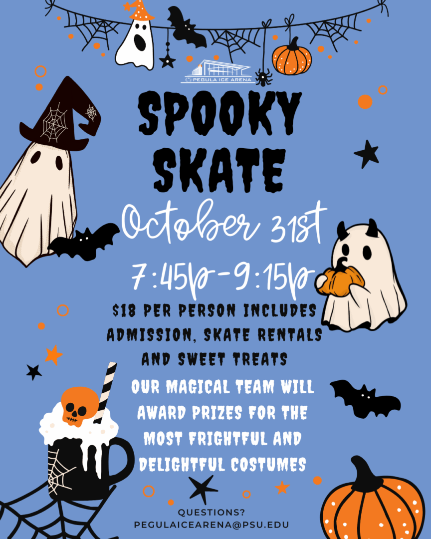Pegula Ice Arena presents Spooky Skate! Join us on Oct. 31, 2025, from 7:45-9:15 p.m. Admission $18.00