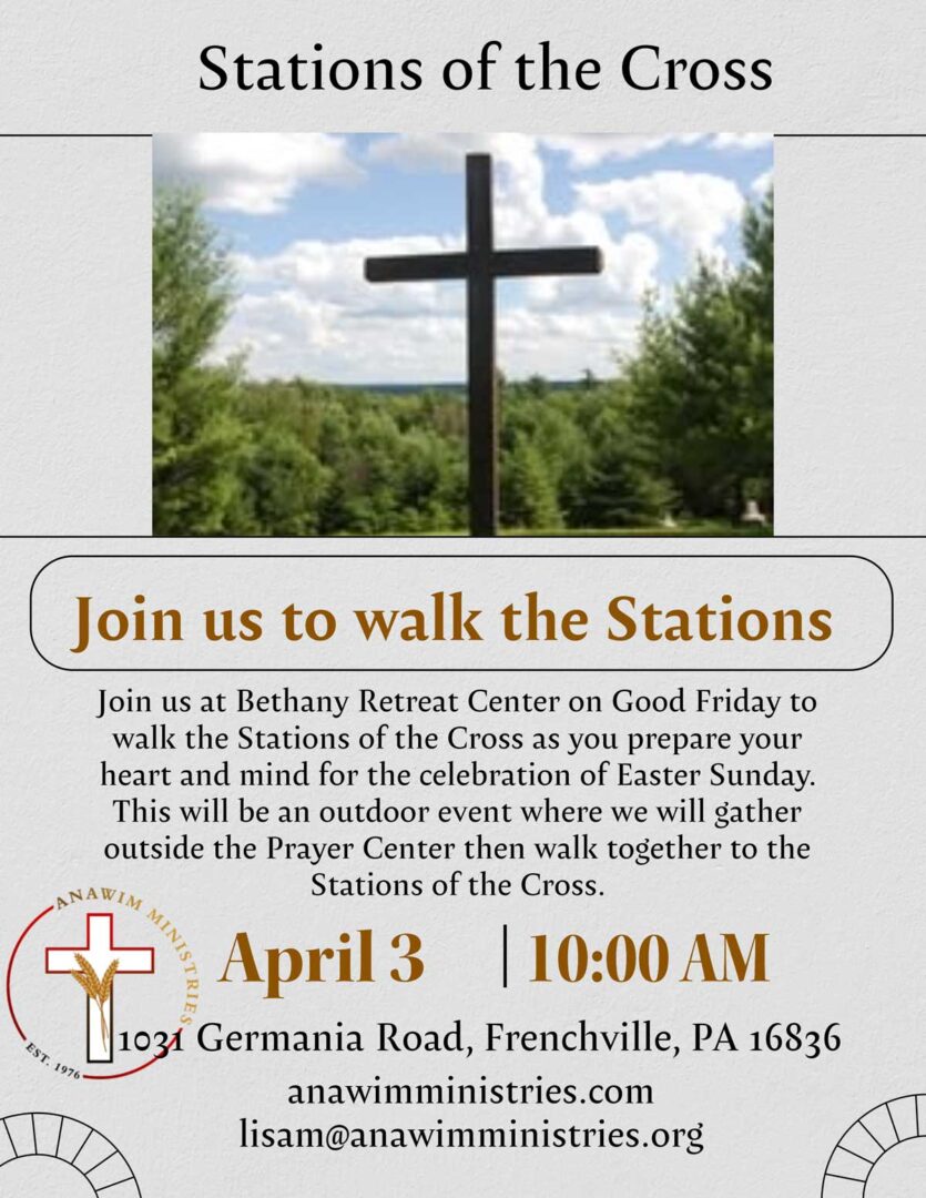 Join us at Bethany Retreat Center on Good Friday to walk the Stations of the Cross as you prepare your heart and mind for the celebration of Easter Sunday. This will be an outdoor event where we will gather inside the Prayer Center then walk together to the Stations of the Cross. There will be prayer and reading at each station, culminating at the top of the hill with the Resurrection Cross. We will gather in the Prayer Center, then those praying the outdoor stations will depart from there.