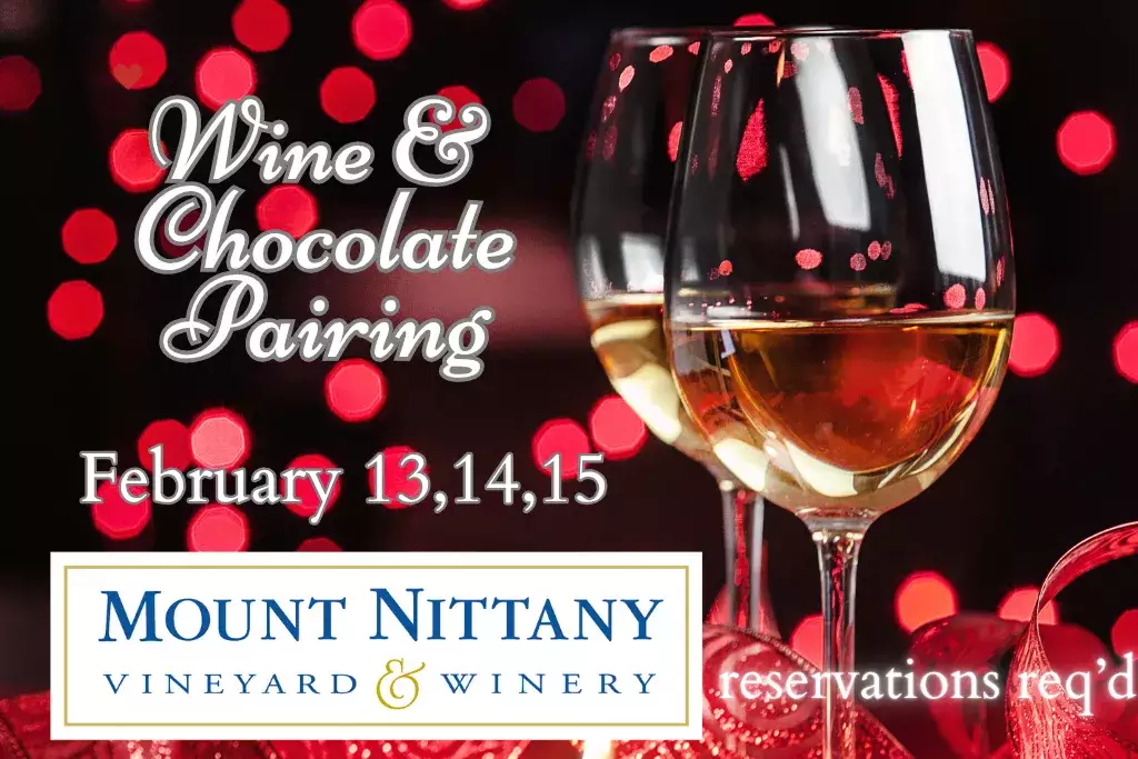 You and your Valentine are invited to attend Wine & Chocolate Pairings at the Winery. Treat your sweetheart, friend, or come as a group and enjoy Mount Nittany’s award-winning wines paired with delicious Asher’s Chocolates. Special event hours are Friday, Saturday and Sunday, February 13,14, and 15 from 12:00 – 3:30pm.