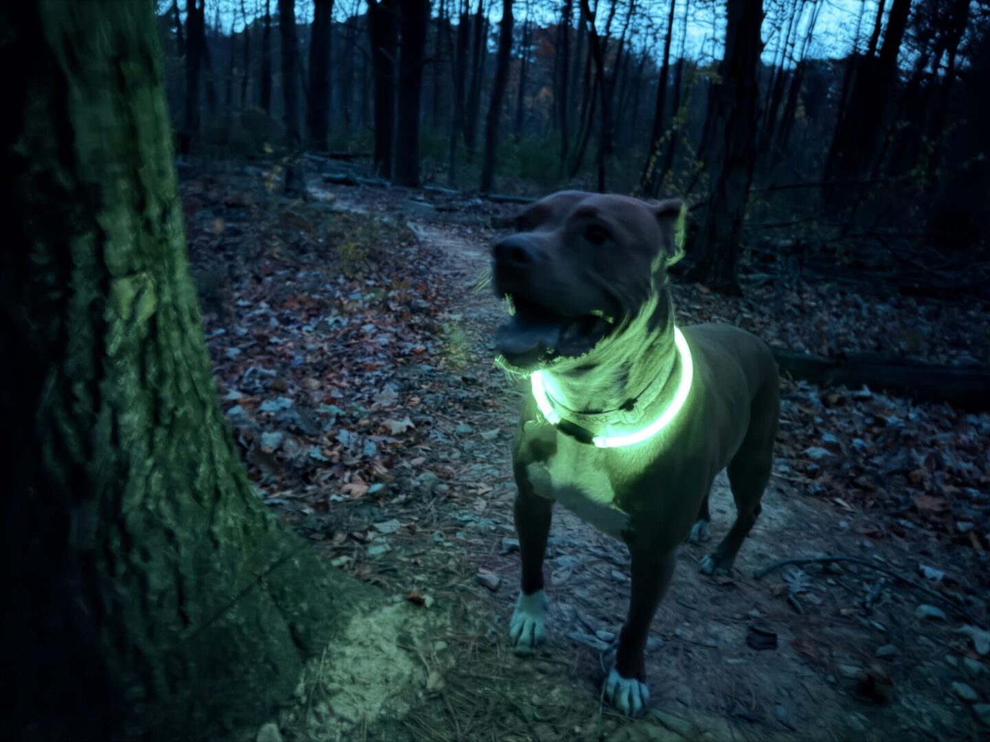I did keep Peggy’s glow collar and bell on her so I always knew where she was. This is a must-do on night hikes with dogs.